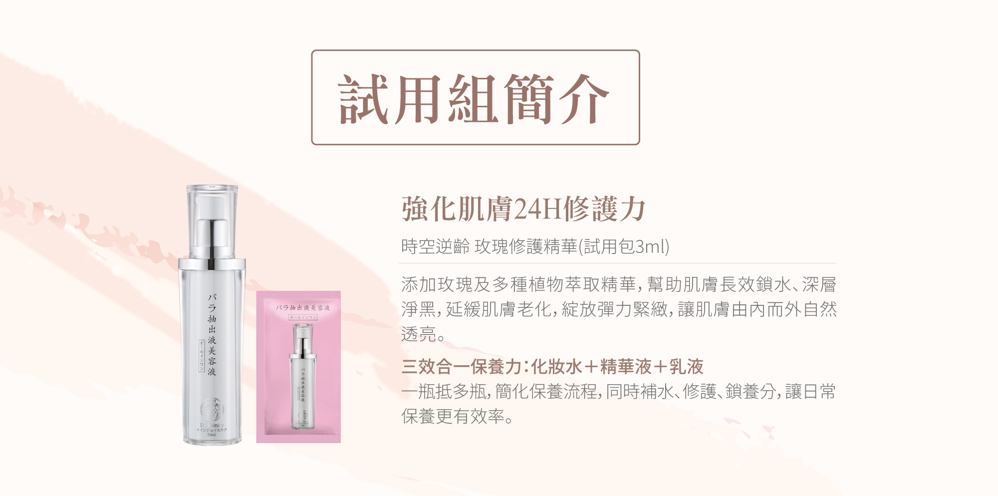 【酵母胺基酸活顏潔膚露3mlx2包、時空逆齡玫瑰修護精華3mlx2包、煥妍撫齡極效時空膠囊2顆/包x2包】,價值800元 。