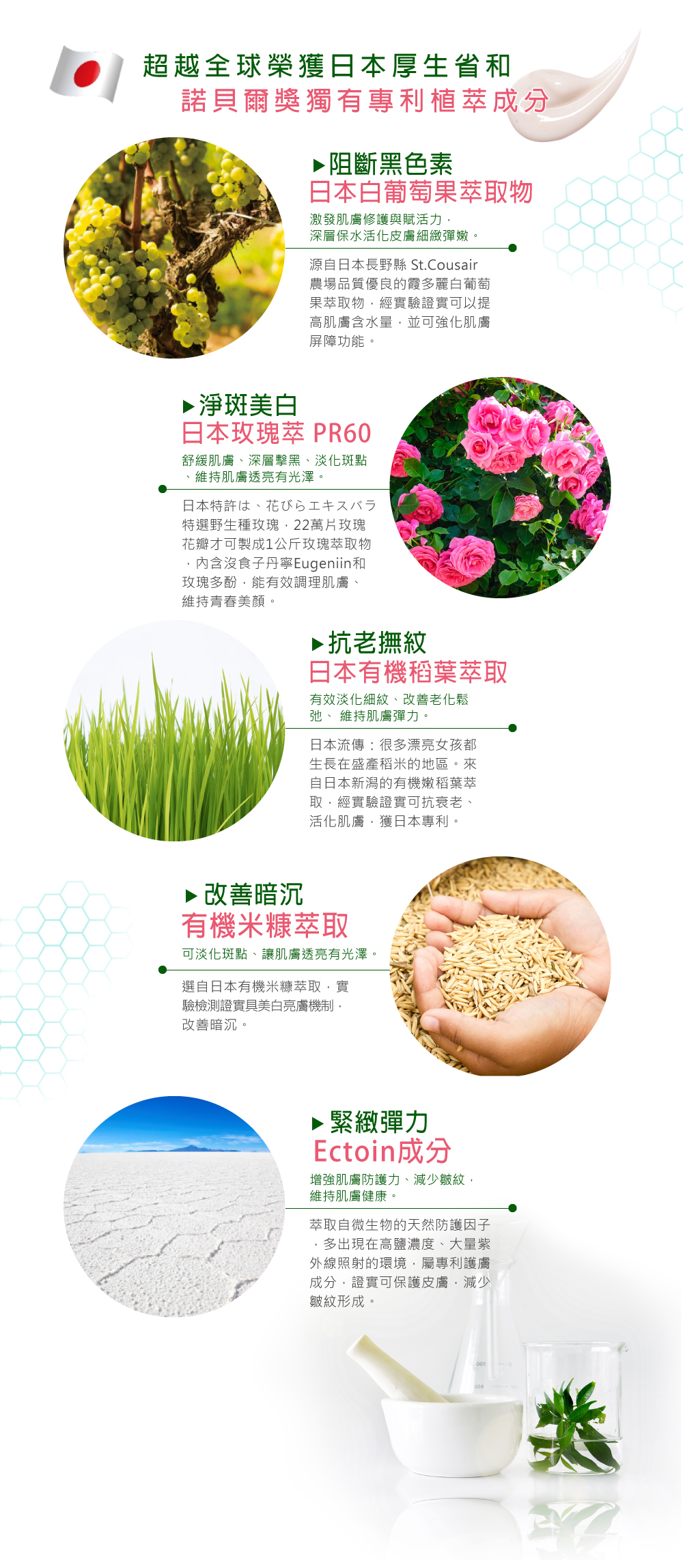 用途:濃縮精華劑型,頂級抗老配方,改善肌膚暗沉、撫平皺紋、淡化細紋黑斑、改善肌膚老化。使肌膚回復彈性光澤亮麗,逆轉肌齡,重返青春。