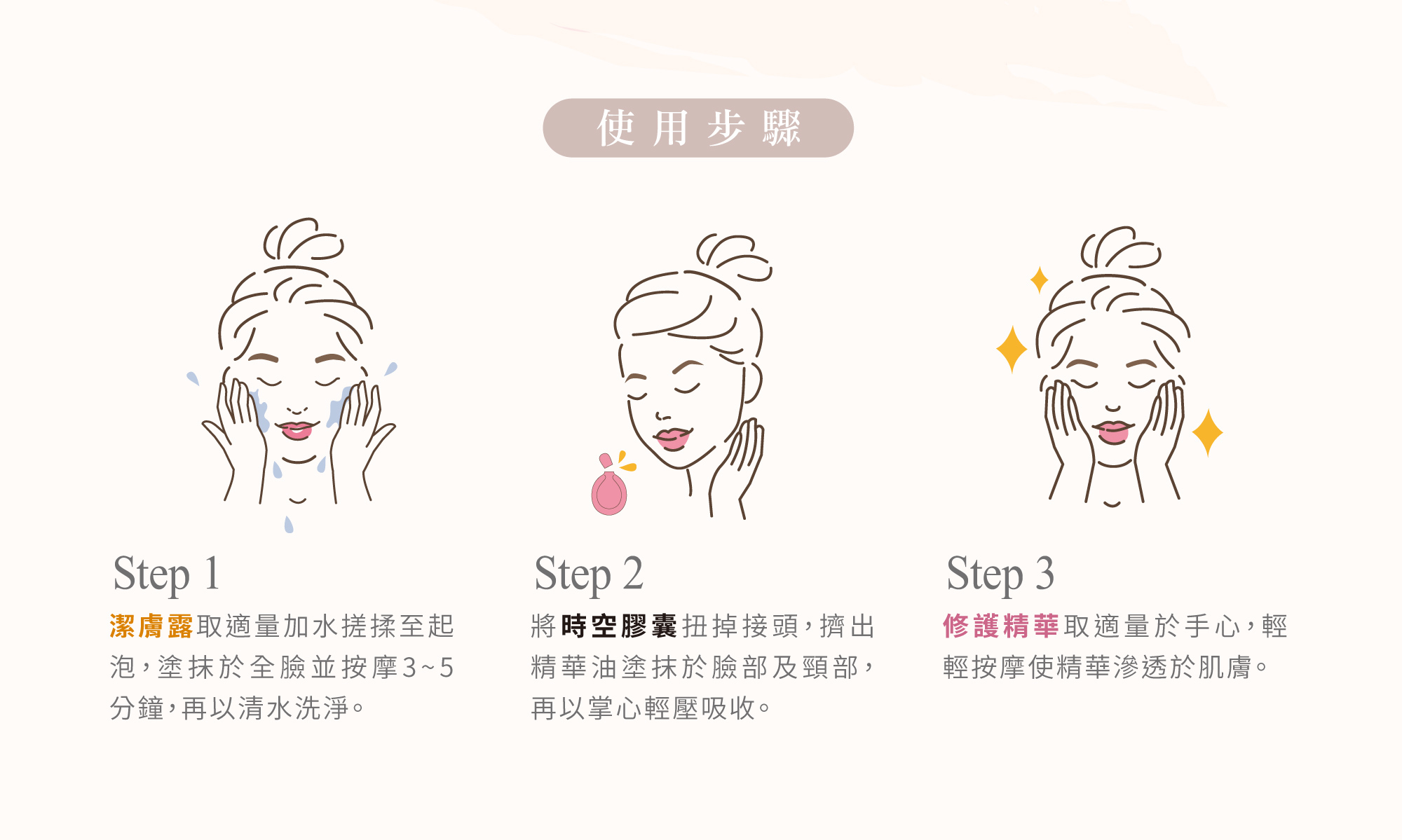 用法:清潔肌膚後,取一顆「煥妍撫齡極效時空膠囊」扭掉接頭,擠出精華於手掌,均勻塗抹於臉部及頸部,運用掌心溫度輕壓至吸收。