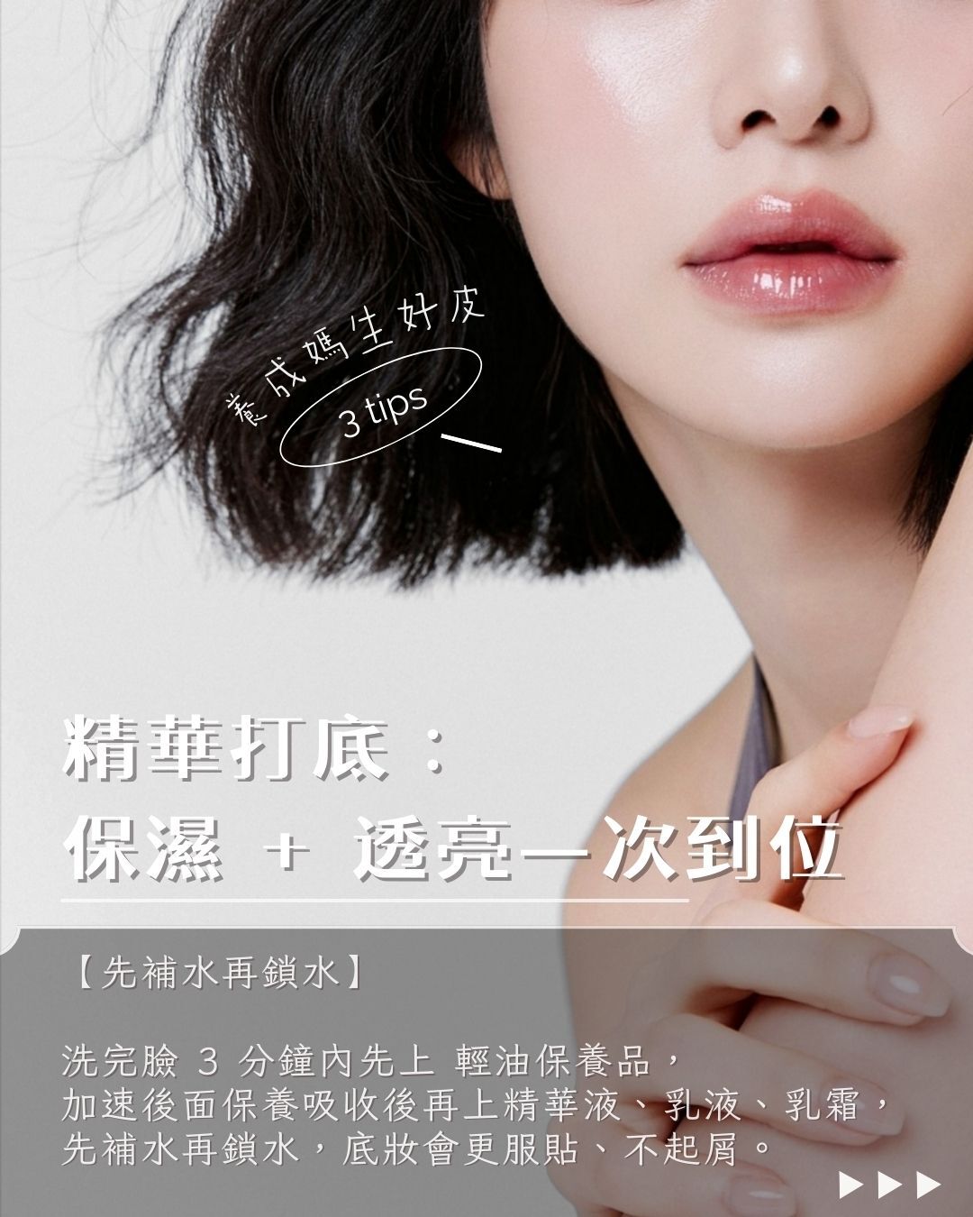 洗完臉 3 分鐘內上精華,先補水再鎖水