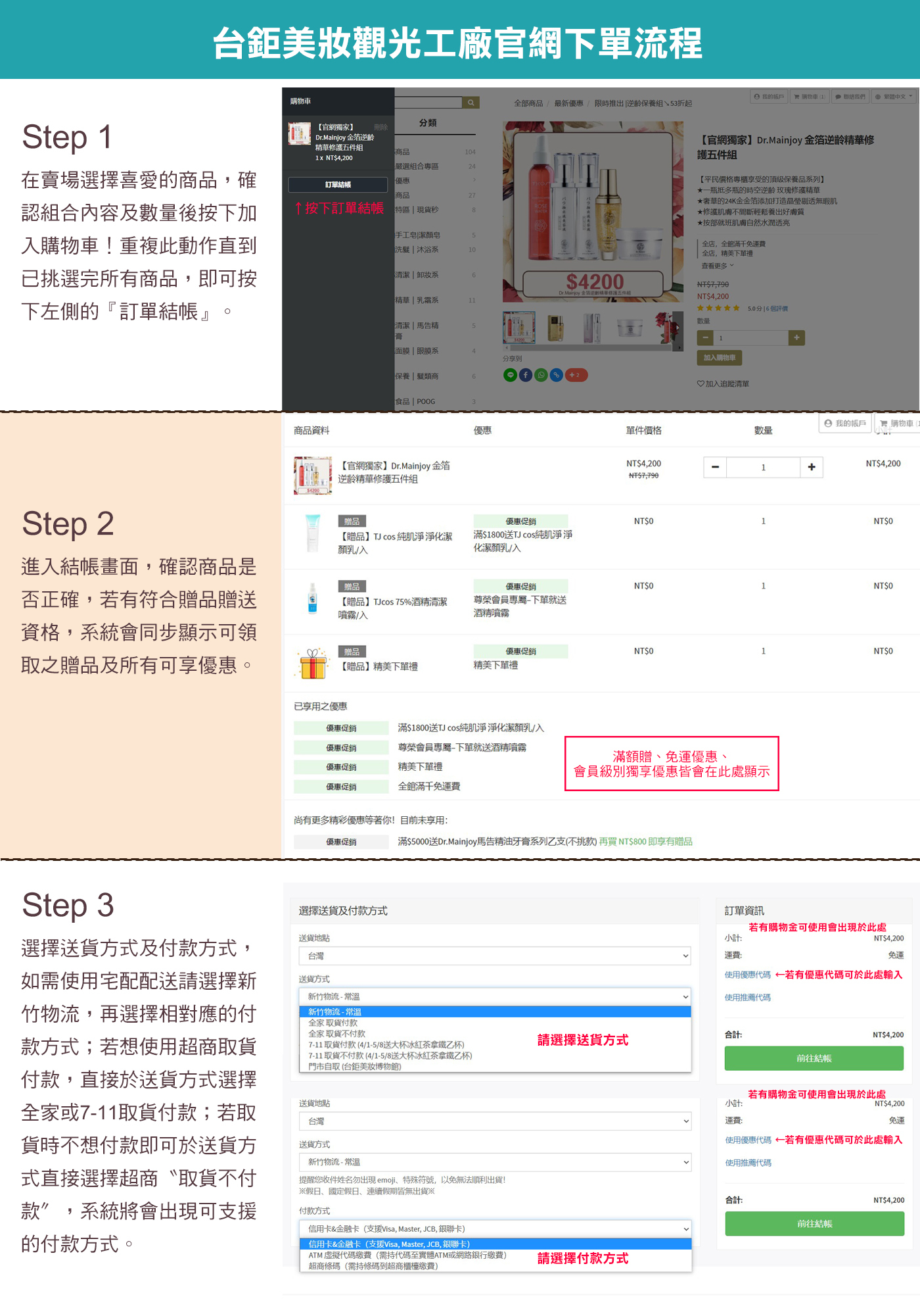 登入會員(第一次購買者請加入會員)→ 選擇商品 → 加入購物車 → 結帳 → 填寫送貨資料 →確認送貨與訂購資訊→ 進行付款 → 完成訂購。