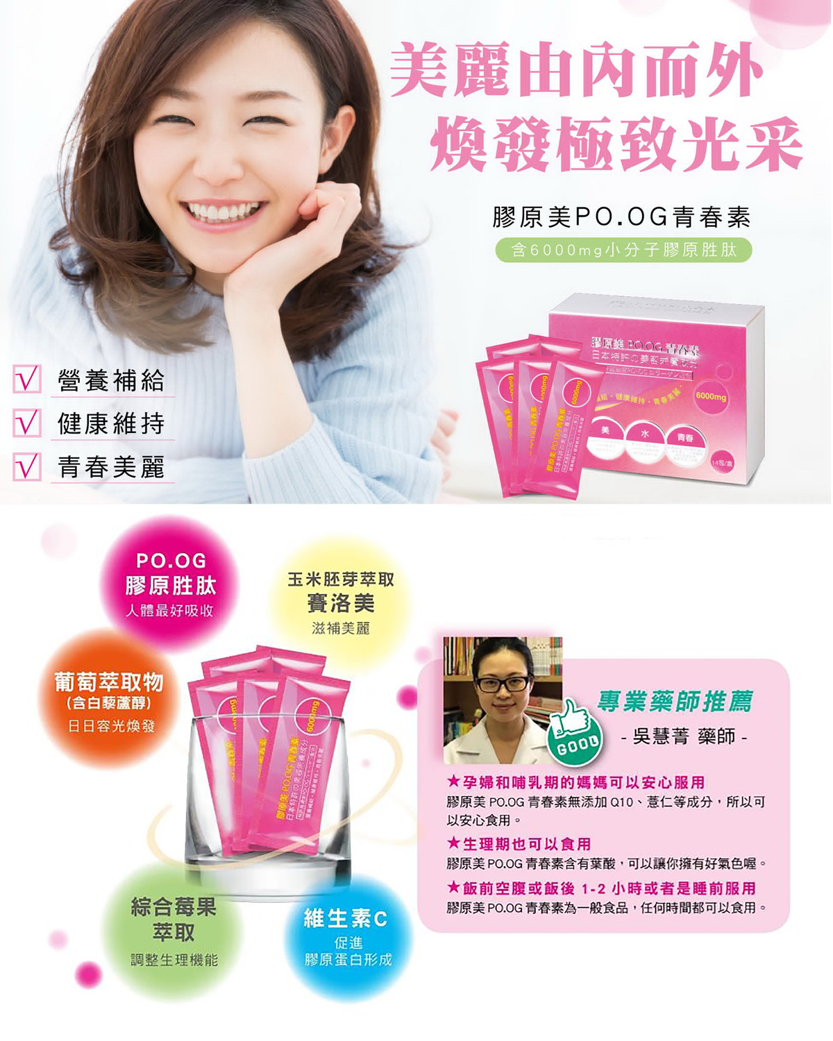 女性養顏美容、維持青春美麗必備品,PO.OG膠原胜肽6000mg, 玉米胚芽萃取物 (含賽洛美)、葡萄萃取物(含白藜蘆醇)及綜合莓果萃取---含巴西莓、蔓越莓、覆盆莓、藍莓、石榴、草莓、西印度櫻桃、黑莓、山竹果、智利酒果、葡萄籽、枸杞,含有植物多酚,可調整生理機能。口味好吃,方便攜帶,可作為每日營養補給、健康美麗維持的好方法。