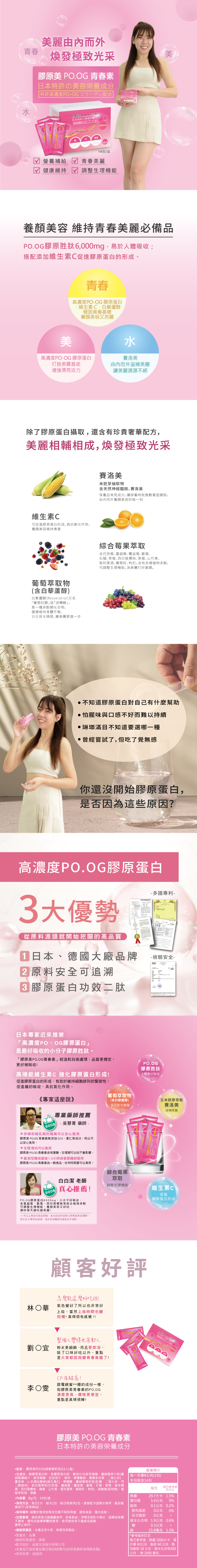 女性養顏美容、維持青春美麗必備品,PO.OG膠原胜肽6000mg, 玉米胚芽萃取物 (含賽洛美)、葡萄萃取物(含白藜蘆醇)及綜合莓果萃取---含巴西莓、蔓越莓、覆盆莓、藍莓、石榴、草莓、西印度櫻桃、黑莓、山竹果、智利酒果、葡萄籽、枸杞,含有植物多酚,可調整生理機能。口味好吃,方便攜帶,可作為每日營養補給、健康美麗維持的好方法。