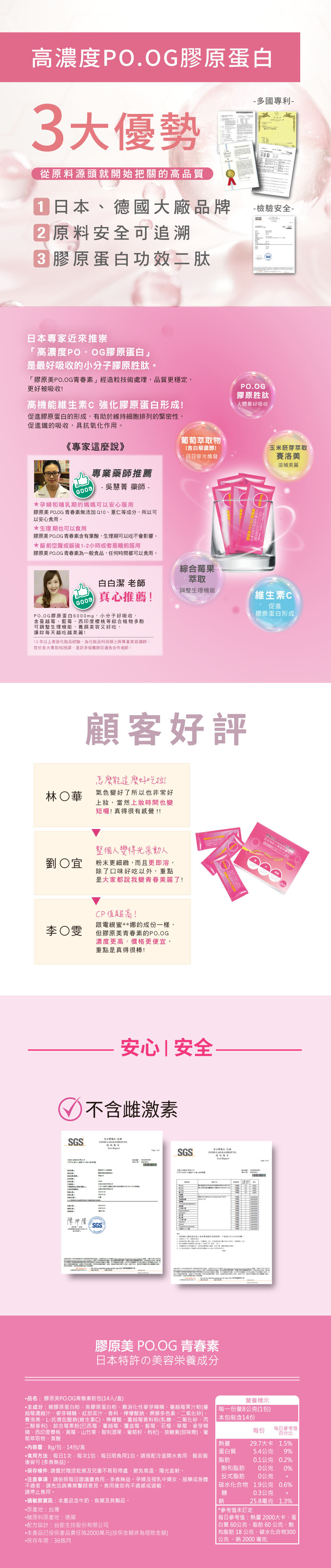 女性養顏美容、維持青春美麗必備品,PO.OG膠原胜肽6000mg, 玉米胚芽萃取物 (含賽洛美)、葡萄萃取物(含白藜蘆醇)及綜合莓果萃取---含巴西莓、蔓越莓、覆盆莓、藍莓、石榴、草莓、西印度櫻桃、黑莓、山竹果、智利酒果、葡萄籽、枸杞,含有植物多酚,可調整生理機能。口味好吃,方便攜帶,可作為每日營養補給、健康美麗維持的好方法。