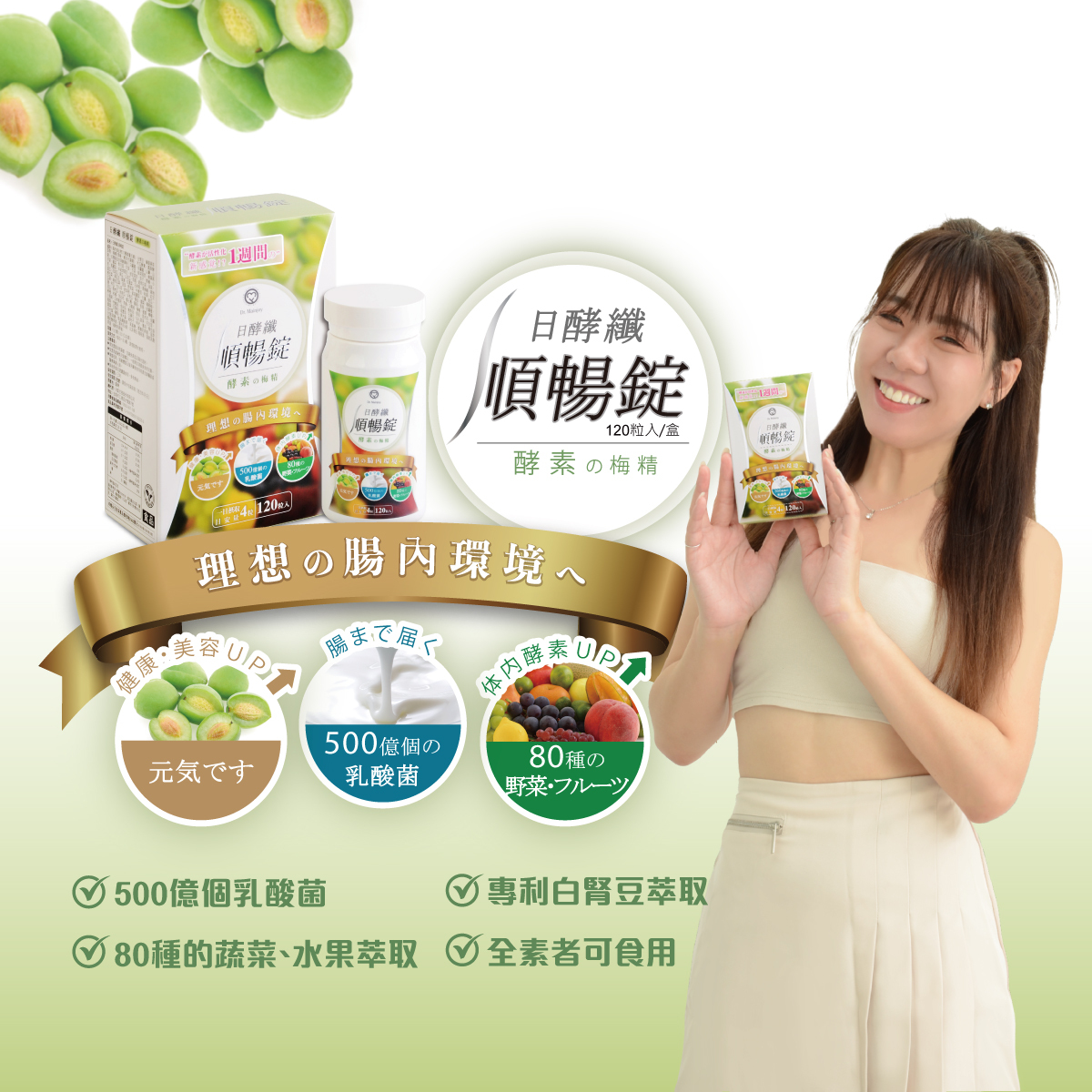 成分:海水抽出物(73種微量元素)、白腎豆、藤黃果萃取物、梅精(青梅、難消化糊精)、木瓜酵素、鳳梨酵素、80種綜合水果酵素粉(白蘿蔔、胡蘿蔔、山藥、山芹菜、蕹菜、青花菜、芹菜、芥菜、結球萵苣、劍葉萵苣、高麗菜、半結球萵苣、球莖萵苣、茄子、青椒、小黃瓜、花胡瓜、南瓜、山苦瓜、茼蒿、結球白菜、油菜、蚵白菜、長虹豆、扁蒲、紅鳳菜、玉米筍、青辣椒、紫地瓜葉、綠地瓜葉、菠菜、野莧菜、牛番茄、秋葵、紅甘藷、冬瓜、大心菜、甜菜根、紫高麗菜、生薑、甜瓜、西瓜、青木瓜、哈密瓜、洋香瓜、番茄、鳳梨、葡萄柚、柳橙、柑橘、茂谷柑、番石榴、葡萄、香蕉、波羅蜜、火龍果、日本蜜柑、青梅、白葡萄、桑葚、蜜棗、檸檬、蜜梨、杏鮑菇、金針菇、鮑魚菇、香菇、黑木耳、葫蘆蔔葉、五葉松、咸豐草、石蓮花、仙人掌果、花生莖、淡竹葉、蘿勒、辣木葉、破布子、枸杞、薄荷、複合益生菌(菊糖、微晶纖維素、果寡糖、嗜酸乳桿菌、鼠李糖乳酸桿菌、雷特氏B菌、比菲德氏-龍根菌、副乾乳酪桿菌、植物乳桿菌)