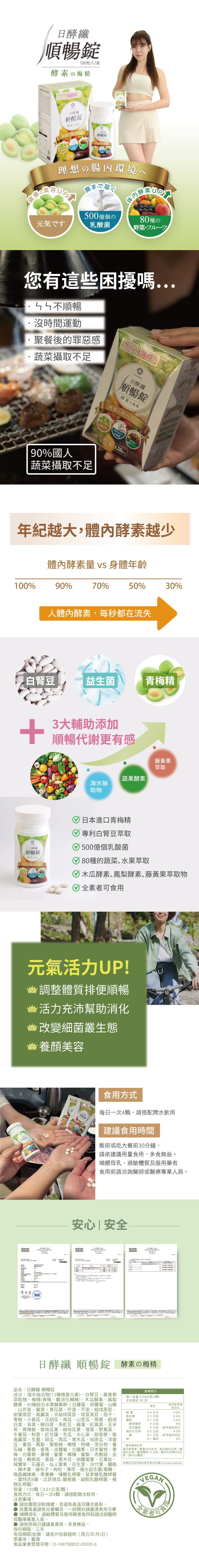 成分:海水抽出物(73種微量元素)、白腎豆、藤黃果萃取物、梅精(青梅、難消化糊精)、木瓜酵素、鳳梨酵素、80種綜合水果酵素粉(白蘿蔔、胡蘿蔔、山藥、山芹菜、蕹菜、青花菜、芹菜、芥菜、結球萵苣、劍葉萵苣、高麗菜、半結球萵苣、球莖萵苣、茄子、青椒、小黃瓜、花胡瓜、南瓜、山苦瓜、茼蒿、結球白菜、油菜、蚵白菜、長虹豆、扁蒲、紅鳳菜、玉米筍、青辣椒、紫地瓜葉、綠地瓜葉、菠菜、野莧菜、牛番茄、秋葵、紅甘藷、冬瓜、大心菜、甜菜根、紫高麗菜、生薑、甜瓜、西瓜、青木瓜、哈密瓜、洋香瓜、番茄、鳳梨、葡萄柚、柳橙、柑橘、茂谷柑、番石榴、葡萄、香蕉、波羅蜜、火龍果、日本蜜柑、青梅、白葡萄、桑葚、蜜棗、檸檬、蜜梨、杏鮑菇、金針菇、鮑魚菇、香菇、黑木耳、葫蘆蔔葉、五葉松、咸豐草、石蓮花、仙人掌果、花生莖、淡竹葉、蘿勒、辣木葉、破布子、枸杞、薄荷、複合益生菌(菊糖、微晶纖維素、果寡糖、嗜酸乳桿菌、鼠李糖乳酸桿菌、雷特氏B菌、比菲德氏-龍根菌、副乾乳酪桿菌、植物乳桿菌)
